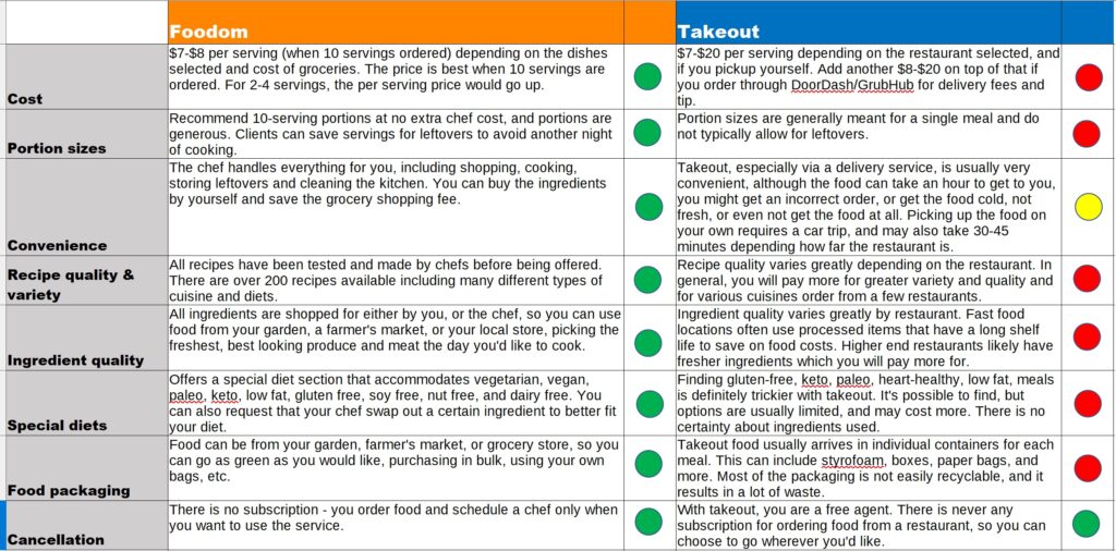 A personal chef costs MUCH LESS than takeout, the recipes have more variety and dietary options, the food is fresher, and there is very little packaging waste.