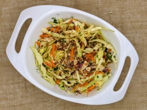 In a small bowl whisk together the dressing ingredients through to the honey. Next whisk in the avocado oil and the sesame oil. Set aside.