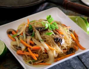 JapChae is a Korean stir fry dish made with cellophane (yam starch) noodles and vegetables. It's topped with a slightly sweet soy-sesame sauce for a perfect balance of sweet and salty.