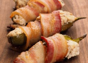Cut the slices of bacon in half crosswise and wrap each pepper half in a slice of bacon, using a toothpick to secure the bacon.