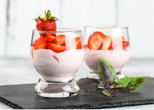 Spoon berries on top. Place a little fresh basil as garnish and half a strawberry on the rim of the glass. You may also wet the rim of the glass ahead of time with a lemon wedge and dip the rim in sugar for decoration.