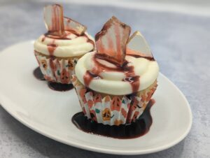 Stab each frosted cupcake with a few shards of broken sugar glass. Drizzle on drops of "blood" to complete the effect.