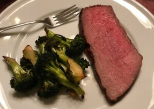 This lean cut is broiled to create a flavorful and juicy steak. Served with a side of broccoli.