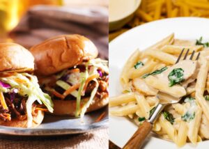 With this selection you'll get two different chicken dishes with 4 servings each. First, enjoy Buffalo Chicken Sliders, bursting with flavor and perfectly paired with a crunchy, colorful slaw. And second, enjoy a creamy yet light pasta dish packed with lean protein, fiber-rich ingredients, and heart-healthy fats.