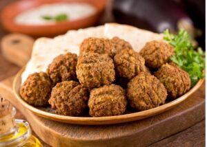 Heat falafel in the oven at 350 degrees for 15 minutes. Warm pita in the microwave on medium high power until heated through.