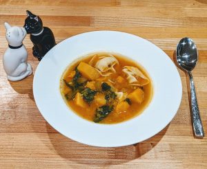 Pour in low sodium chicken broth. Bring soup to a simmer. Once simmering, add in cheese tortellini. Add in spinach and allow to wilt. Simmer for two minutes. Then serve.