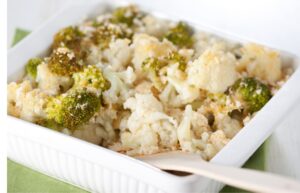 Cauliflower and brocolli combine with other vegetables, are then seasoned with curry and garlic, then layered over jasmine rice for a hearty and delicious casserole.