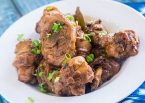 Chicken is braised in a sweet soy-vinegar and garlic sauce to make this classic Philipino dish. Serve over white rice and add a vegetable for a complete meal.