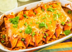 4. Microwave tortillas on high for 30 seconds. This softens them and makes them more pliable. Coat the bottom of 2 (13 by 9-inch) pans with a ladle of enchilada sauce. Using a large shallow bowl, dip each tortilla in enchilada sauce to lightly coat. Spoon 1/4 cup chicken mixture in each tortilla. Fold over filling, place 8 enchiladas in each pan with seam side down. Top with remaining enchilada sauce and cheese.