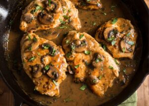 Panfried chicken breasts smothered in sauteed mushrooms, onions, garlic and dry marsala wine.