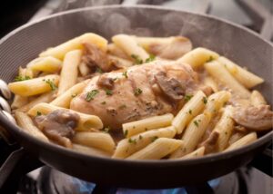 Panfried chicken breasts smothered in sauteed mushrooms, onions, garlic and dry marsala wine served over pasta.