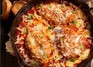 Place ½ the tomato sauce in the bottom of a baking dish(es) that will accommodate all the chicken, slightly overlapping if necessary. Place chicken over sauce and spoon remaining sauce over chicken. Sprinkle with mozzarella cheese, then grated parmesan cheese. Bake, uncovered, for 20 minutes.
