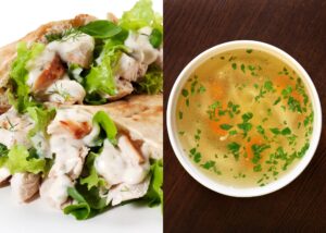 With this selection you get two great chicken dishes. First, a classic chicken salad that's loaded with crunchy vegetables wrapped in a whole wheat pita, and second, a delicious soup made with homemade broth that's filled with hearty vegetables, tender pieces of chicken, and whole wheat pasta, making it a great main dish meal. You will get 4 servings of each dish.