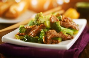 Heat a large sauté pan or wok over medium-high heat. Add half the oil, then carefully place beef pieces in pan, spreading them out. Cook without stirring for a minute or so, then stir-fry until meat is about 80 percent done. Remove beef from pan and reserve.