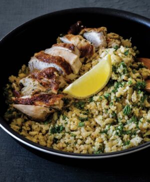 Heat chicken and cauliflower rice in a saute pan set over medium heat until cooked through.
