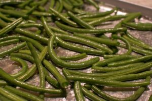 Wash and trim the rough ends off the green beans. Pat them very dry with clean tea towels (wet green beans turn soggy in the oven).