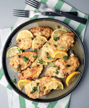 Add the chicken stock and lemon juice to the pan, along with the capers, and let the sauce simmer for 5-8 minutes until reduced. Return the chicken to the pan, coating it in the sauce. Remove from heat, sprinkle with parsley, and serve hot with lemon slices.