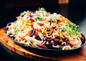 Add noodles, green onion and sauce ingredients. Mix well until the sauce has evenly coated all the vegetables. Cook for two minutes and turn the heat off.
