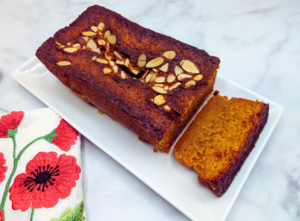 Pour mixture into a loaf pan and sprinkle sliced almonds on top (optional). Bake for 35 minutes. Let cool, serve, and enjoy!