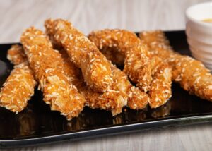 This coconut chicken is breaded in sweet coconut and sesame seeds, then oven-baked, and dipped in a spicy, tangy, creamy restaurant-style bang bang sauce.
