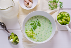 In a blender, combine the cucumbers, yogurt, basil, olive oil, lemon juice, dill, garlic, salt, honey, and several grinds of pepper and blend until smooth. Chill for at least 4 hours.
