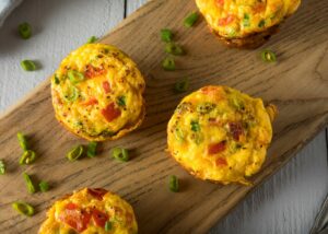 Preheat oven to 400 degrees. Lightly grease a 12 muffin pan or use muffin liners. Divide the onion, green pepper, and ham evenly over the 12 muffin tins. Add the cheddar cheese evenly on the top.