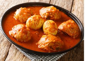 Cut the hard-boiled eggs into wedges. Transfer the chicken drumsticks to a serving platter, garnish with the egg wedges, and ladle the spicy sauce on top.