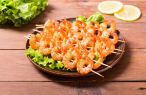 Skewer 5 shrimp on each bamboo skewer. Season with salt and pepper