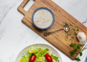 To make the dressing, whisk together all the dry ingredients (chives, parsley, onion powder, garlic powder, salt, and pepper) in a small bowl. Add the mayonnaise, sour cream, milk if needed, and dash of hot sauce if using. Adjust seasonings. Store tightly covered in refrigerator.