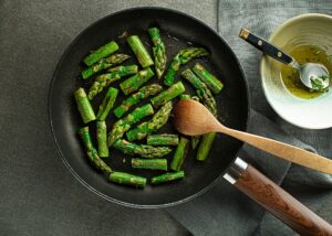 Heat olive oil in a large saute pan over medium-high heat. Add the asparagus. Season with salt and pepper. Saute for 3-5 minutes, until asparagus turns bright green but is still slightly crisp. Add lemon zest in last minute of cooking time. When done, squeeze with a bit of lemon juice if desired.