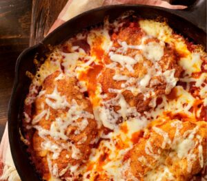 This low carb chicken parmesan is made with an almond flour and parmesan cheese coating, so the chicken stays crisp and moist, plus a homemade sauce for lots of flavor!