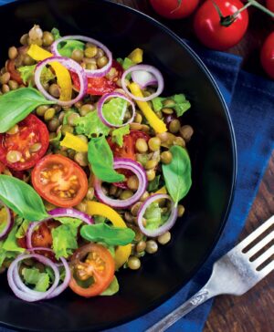 Add cooled lentils to the bowl of salad ingredients and add some of the dressing, tossing to combine. Taste, adding more dressing and adjusting seasonings if needed.