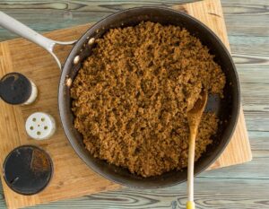 Mix together all the ingredients. Place a non-stick pan over medium heat and add the turkey mixture. Cook slowly so the turkey releases it’s juices and no longer sticks to the pan, about 15 minutes. Mix frequently, breaking up the turkey into small pieces.