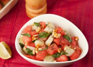 Place watermelon and cucumber in a large bowl; set aside. In a blender, combine remaining ingredients, blending until smooth. Pour dressing over watermelon and cucumber. Toss gently until evenly coated. Refrigerate until ready to serve.