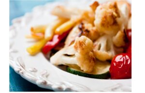 On the sheet pan, combine the cauliflower, carrots, and chickpeas. Pour about ¼ of the oil spice mixture over them and toss well to coat. Arrange veggies in a single layer and roast for 20-25 minutes.