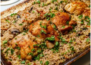 In a 9×13 inch baking dish or oven-safe skillet with sides, toss together the chicken, olive oil, shallots, garlic, thyme, sage, Italian seasoning, chili powder, and season with salt and pepper. Add the wild rice, orzo, mushrooms, celery, and cheese.