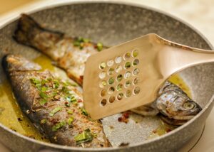 Add the coated trout and cook for 5 minutes on each side or less depending on size of trout. Add sliced almonds last couple minutes of cooking time, being careful not to burn.