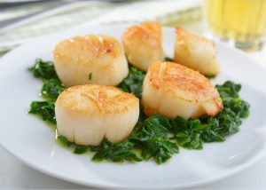 Large sea scallops are sauteed and placed on a bed of garlic spinach, then topped with a rich lemon-butter sauce. Note: Best eaten shortly after cooking.