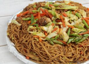 This delicious Filipino dish consists of wheat noodles, crisp vegetables, and tender chicken tossed in a light savory sauce.