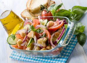 Let rest 30 minutes before eating, tossing occasionally until bread absorbed dressing.