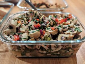 In a non-reactive bowl (preferably glass mixing bowl), toss the mushroom with olive oil, salt and pepper. Let sit for 10 minutes.