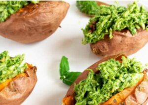 Once the chicken and sweet potatoes are cooked through, remove from the oven and place the chicken into a small bowl. With two forks, shred the chicken until completely pulled. Add the pesto to the chicken and mix together until evenly combined.