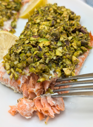 Pistachio-crusted salmon is a sophisticated dish featuring a crunchy, flavorful topping. Each salmon fillet is coated with a mixture of chopped pistachios, garlic, honey, Dijon mustard, and fresh lemon juice, then baked to tender, golden perfection. This recipe is elegant and sure to impress you, your family and/or guests!