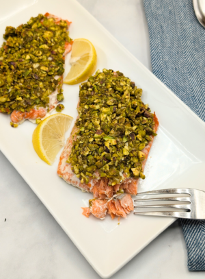 Pistachio-crusted salmon is a sophisticated dish featuring a crunchy, flavorful topping. Each salmon fillet is coated with a mixture of chopped pistachios, garlic, honey, Dijon mustard, and fresh lemon juice, then baked to tender, golden perfection. This recipe is elegant and sure to impress you, your family and/or guests!