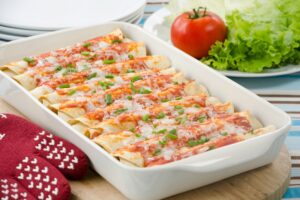 Top enchiladas with cheese and bake 8-10 minutes. Remove from the oven and let stand 2 minutes.
