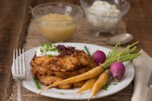 Remove cooked latkes and let drain on a paper towel. Repeat until all the potato mixture is used. Add more butter and oil to the pan as needed to keep the pan well-oiled.