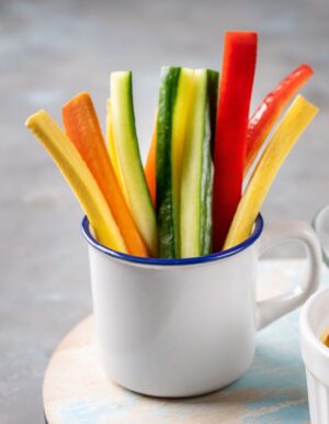 Trim celery at the base by about 2 inches. Separate stalks and wash. Wash all remaining vegetables. Peel cucumber and jicama. Chop all vegetables into dipping size sticks.
