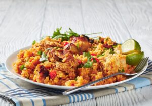 Chicken and rice is a traditional dish served in Spain and throughout Latin America. By using a pressure cooker all the flavors meld together to create a delicious one-pot meal.