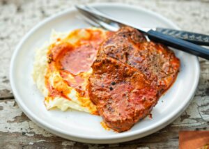 Reheating Instructions Heat steaks in a saute pan over medium heat until heated through, about 10 minutes, adding water if sauce gets too thick. Alternately you can heat in a microwave on high power, turning steaks halfway through cooking time. Heat mashed potatoes and broccolii in the microwave on high power until heated through.