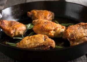 When skillet is hot, add the chicken to the pan and cook with the skin side down until the skin is lightly browned.
